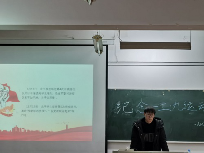各班团支书先介绍了“一二·九”运动发生的背景,接着为同学讲述运动开展过程,在演讲过程中声情并茂,讲到重点处更是义愤填膺。同学们被这种热情感染了,了解到了当时人民觉醒的必要性和必然性。最后,总结了“一二·九”运动的重大历史意义。
