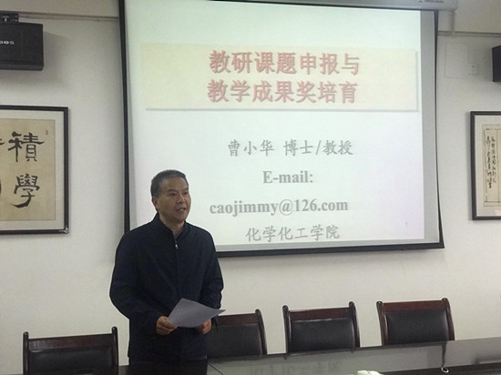 3月31日下午,诸侯快讯特邀化学化工学院副院长曹小华博士在竞知楼904会议室作《教研课题申报与教学成果奖培育》主题讲座。讲座由院长邓长寿主持,全体教职工聆听了讲座。