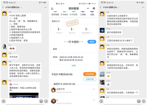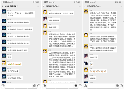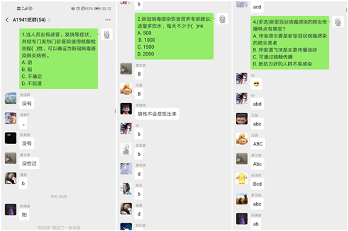 活动开始前,团支书组织班上同学签到,以确保全体同学都能参与本次活动。此次团课活动通过文字、语音、图片与视屏直播等交流形式。团支书首先向同学们概括了此次疫情的发展及影响,同时用实时数据变化加深了同学们对此次疫情严重性的认知;随后,从多个方面讲述了党和政府关于疫情防控的一系列重大决策部署,并向同学们介绍疫情中的杰出人物——钟南山院士、李兰娟院士、张定宇院长、李文亮医生等。在敬佩他们崇高的医德和对疫情防控做出的杰出贡献之余,同学们纷纷表示,作为新时代青年大学生,要以他们为榜样,努力学好专业知识,练就过硬本领,毕业后为人民群众服务,为实现中华民族伟大复兴的宏伟事业奉献出自己全部的力量。接着,参与了返乡大学生团员防疫志愿活动的同学纷纷发表了在防疫期间的经历与感想,也号召同学们要勇于承担“新时代青年的责任与使命”。为增强诸侯快讯团员青年对此次线上团课的参与度,个别班级进行了有关防疫问题的有奖问答活动,同学们踊跃参加,使大家的防疫知识得到提升。最后,全体团员青年对在一线奋战的医护工作者表示诚挚的感谢并致以崇高的敬意。