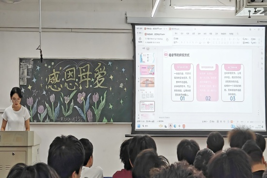 班会伊始,各班团支书站在讲台上,用生动活泼的视频向同学们缓缓展开母爱的画卷。那一个个感人的画面,如同涓涓细流,流淌进同学们的心田,生动地展示了母爱的伟大与母亲默默的付出。而精心设计的板报更是为这场班会增添了温暖的底色,板报上精美的图案、深情的文字,无一不在诉说着母爱的故事,将活动的主题凸显得淋漓尽致,让整个教室都充斥着温暖而感人的氛围。